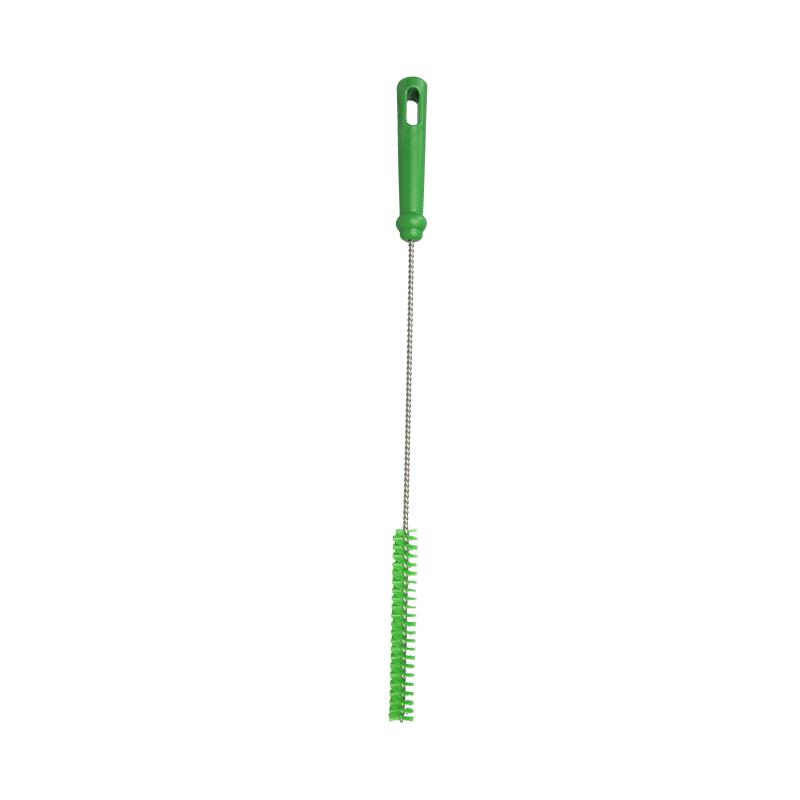 Ёршик для очистки труб/бутылок FBK средней жёсткости 500×20 мм зелёный <br><br>Ёршик для чистки труб FBK 500×20 мм жёлтый предназначен для мойки труб, бутылок, технологических отверстий и труднодоступных мест. Он оснащён нержавеющим стержнем и пластиковой ручкой. Щетина средней жёсткости удаляет загрязнения с различных поверхностей. Ёршик имеет сквозное отверстие для подвешивания, что облегчает хранение.<br><br>Ёршик выполнен из синтетической щетины полиэстера РBT, нержавеющей стали и полипропилена. Размер рабочей части составляет 150×20 мм, толщина щетины — 0.30 мм. Общая длина ёршика — 500 мм. Он выдерживает температуры от −20 °С до +134 °С и допускает автоклавирование при температуре 134 °С.<br><br>Ёршик соответствует требованиям ХАССП и предназначен для профессионального использования. Жёлтый цвет и компактная конструкция обеспечивают удобство в работе.<br><br>Внешний вид и/или характеристики товара могут быть изменены производителем в соответствии с производственным процессом.