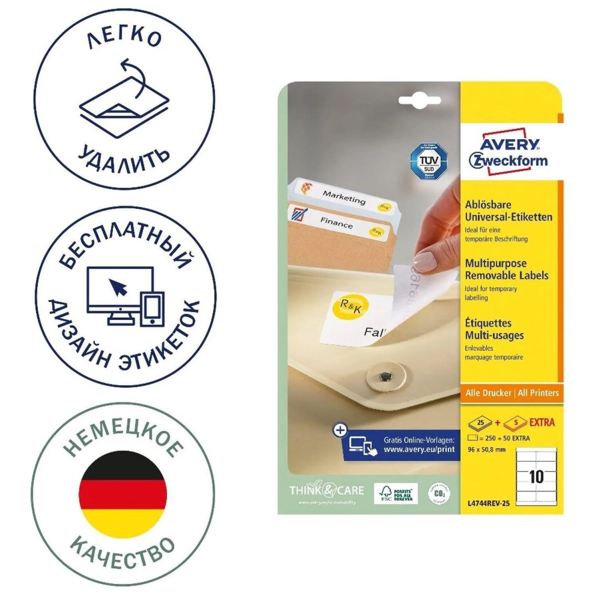 Артикул производителя L4744REV-25.<br><br>Этикетки для многоразового использования. Отклеиваются быстро и полностью, не оставляют следов клея на поверхности. Сохраняют свойства при повторном употреблении. Белые, прямоугольные, с закругленными краями. Размер 96×50.8 мм, 10 штук на листе, 25 листов в упаковке + 5 листов в подарок! Оптимальное решение для маркировки стеклянных, керамических и металлических поверхностей. Этикетки подходят для печати на лазерных и струйных принтерах. Можно оставлять надписи от руки.<br><br>Вы сможете гарантированно распечатать этикетки на офисном принтере без застревания листов в принтерах. Это подтверждает немецкая сертификация TÜV SÜD (Объединение Технического надзора). Этикетки имеют высокую степень белизны. Все этикетки имеют сертификацию FSC<sup class="reg">®</sup>(Forest Stewardship Council). Материал, из которого изготовлены этикетки, получен из ответственно управляемых лесов. Этикетки, сделанные из экологичных материалов и не содаржат хлора.<br><br>Благодаря бесплатному программному обеспечению и шаблонам Avery Zweckform Вам совсем не нужно тратить время на дизайн и печать этикеток и самоклеящейся бумаги. Мы предлагаем большой выбор дизайнов и готовых шаблонов для печати. Просто введите номер артикула с упаковки, выберите нужный дизайн, создайте свою этикетку и распечатайте! Готово!