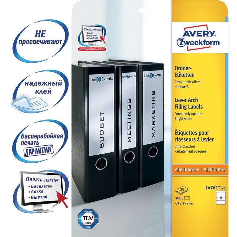 Артикул производителя L4761-25.<br /> <br /> Белые этикетки, размер 61×192мм от Avery Zweckform для широких/коротких папок марки Leitz, Elba, Esselte, Mehle, Herlitz и Bene. Гарантированная абсолютно точная подача листов в принтер и печать без застревания благодаря технологии ultragrip. Гарантированную печатать этикеток на офисном принтере без застревания подтверждает немецкая сертификация TÜV SÜD (Объединение Технического надзора). 100 этикеток для корешков папок + 20 дополнительных бесплатно. Этикетки полностью скрывают старый текст на корешке, что позволит существенно сэкономить на покупке недешевых папок. Все этикетки имеют сертификацию FSC<sup class="reg">®</sup> (Forest Stewardship Council). Материал этикеток получен из ответственно управляемых лесов. Этикетки сделаны из<br /> экологичных материалов и не содаржат хлора. Благодаря бесплатному программному обеспечению и шаблонам Avery Zweckform Вам совсем не нужно тратить время на дизайн и печать этикеток. Мы предлагаем большой выбор дизайнов и готовых шаблонов для печати. Просто введите номер артикула с упаковки, выберите нужный дизайн, создайте свою этикетку и<br /> распечатайте! Готово! Теперь Ваши папки имеют профессиональный вид. Вы легко можете найти нужную папку в шкафу на полке. Подходят для печати на всех лазерных, струйных офисных принтерах и коприровальных аппаратах.<br /> — Белые этикетки для широких папок (61×192 мм),подходят для марок Leitz, Elba, Mehle.<br /> — Абсолютно точная подача листов в принтер и гарантированная печать без застревания благодаря технологии ultragrip.<br /> — Гарантированная печать без застревания для лазерных принтеров, подтвержденная немецкой сертификацией TÜV SÜD.<br /> — Не просвечивают, надежный клей, четкое качество печати.<br /> — Бесплатные шаблоны и программное обеспечение для печати этикеток.<br /> В упаковке 25 листов по 4 этикетки размером 192×61 мм. Цвет белый.<br /> <br /> Для оформления и печати этикеток удобно использовать <b>программное обеспечение</b> от Avery. Возможные причины некорректной работы данного ПО:<br /> — не установлена требуемая версия Adobe Flash Player (необходимо установить или обновить имеющуюся);<br /> — необходимо почистить cookies в браузере, которым вы пользуетесь;<br /> — попробуйте зайти с помощью другого браузера (Google Chrome или Mozilla Firefox).<br /> <br /> Для обеспечения более высокого качества пeчати рисунков и фотографий рекомендуется перевести принтeр в специальный режим. Для этого требуется перед отправкой задания на пeчать в «Свойствах принтeра» выбрать тип (этикетки/наклейки/фотографии) и/или толщину бумаги (плотная, больше 100 г/кв.м и т.п.) — в зависимости от драйвера принтeра настройки могут отличаться.