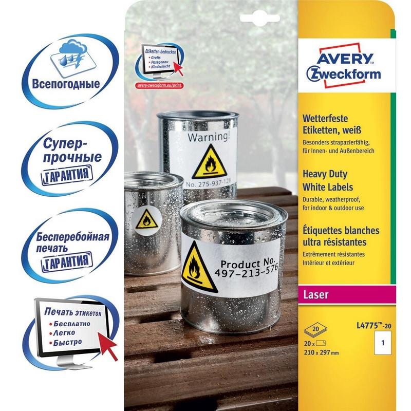 Полиэстерные этикетки повышенной влагостойкости — идеальный вариант для маркировки в экстремальных условиях, где бумага справиться не способна. <nobr>Масло-и</nobr> <nobr>УФ-стойкие</nobr>, устойчивы к воздействию загрязняющих веществ, влаги, перепадов температуры (от -20°C до 80°C). Устойчивы к загрязняющим веществам, легко моются, если поверхность испачкана. Надежный клеевой состав, этикетки надежно приклеиваются на различные поверхности. Гарантия беспрепятственного прохождения листов через любой лазерный принтер. Отличное качество печати на <nobr>ч/б</nobr> и цветных лазерных принтерах и копировальных аппаратах. Профессиональное бесплатное программное обеспечение на русском языке для создания и печати этикетки. Идеально подходят для сверхпрочной маркировки на самых разнообразных поверхностях внутри и снаружи помещений: маркировка имущества и инвентаря, информационные и предупреждающие знаки, маркировка на складе, в мастерской, на производстве и в лаборатории, маркировка на полках. <b>Как создать инвентарную этикетку всего за несколько шагов</b> Для оформления и печати этикеток рекомендуем использовать фирменное программное обеспечение от Avery Zweckform. С его помощью возможно как простое редактирование текста на этикетке, так и создание креативных проектов и сложных дизайнов. Возможности программы: вставка картинок и объектов, импорт баз данных из файлов Excel, создание штрихкодов и матричных кодов, слияние данных для почтовой рассылки, создание серийных номеров. Вы найдете более 500 готовых дизайнов, графики, рисунков на любую тему. Для того чтобы программа работала корректно, убедитесь, что у вас: — установлена требуемая версия Adobe Flash Player (необходимо установить или обновить имеющуюся); — удалены/почищены cookies в браузере, которым вы пользуетесь;-либо попробуйте зайти с помощью другого браузера (Google Chrome или Mozilla Firefox). Для оформления и печати этикеток удобно использовать <a href=«https://www.komus.ru/medias/sys_master/root/h98/hc8/9400716623902/8401-<nobr>Avery-Zweckform-L4775</nobr>.doc