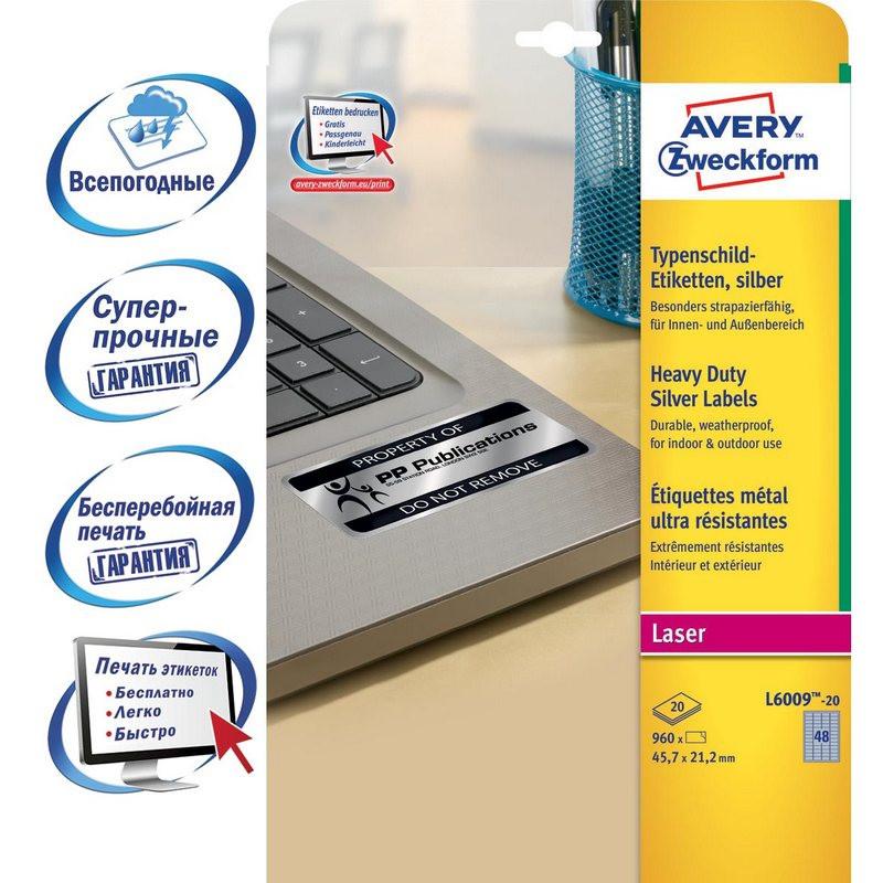 • Этикетки из прочной полиэстерной пленки серебристного цвета — идеальный вариант для маркировки инвентаря, электронных компонентов, указания паспортных данных, инвентарной описи.<br>• Масло-и УФ-стойкие, устойчивы к воздействию загрязняющих веществ, влаги, перепадов температуры (от −40°C до +150°C).<br>• Устойчивы к загрязняющим веществам, легко моются, если поверхность испачкана.<br>• Надежный клеевой состав, этикетки надежно приклеиваются на различные поверхности. <br>• Гарантия беспрепятственного прохождения листов через любой черно-белый лазерный принтер. <br>• Гарантированное запекание тонера и четкий отпечаток текста при печати на черно-белых лазерных принтерах.<br>• Профессиональное бесплатное программное обеспечение на русском языке для создания и печати этикетки.<br><br>Идеально подходят для стильной инвентарной маркировки на самых разнообразных поверхностях: маркировка дорогостоящего имущества и инвентаря, маркировка компьютерной и электробытовой техники, маркировка архивов и оборудования в офисах и банках.<br><br>Как создать серебристую этикетку всего за несколько шагов<br><br>Для оформления и печати этикеток рекомендуем использовать фирменное<b> программное обеспечение</b> от Avery Zweckform. С его помощью возможно как простое редактирование текста на этикетке, так и создание креативных проектов и сложных дизайнов. Возможности программы: вставка картинок и объектов, импорт баз данных из файлов Excel, создание штрихкодов и матричных кодов, слияние данных для почтовой рассылки, создание серийных номеров. Вы найдете более 500 готовых дизайнов, графики, рисунков на любую тему.<br>Для того чтобы программа работала корректно, убедитесь, что у вас:<br>— установлена требуемая версия Adobe Flash Player (необходимо установить или обновить имеющуюся);<br>— удалены/почищены cookies в браузере, которым вы пользуетесь;<br>— либо попробуйте зайти с помощью другого браузера (Google Chrome или Mozilla Firefox).<br>Также целесообразно использовать <b>шаблон</b> в формате Word. Для удобства работы с рисунками необходимо выделить вставленный в шаблон рисунок левой кнопкой мыши, открыть вкладку «Формат» и выбрать режим «Обтекание текстом — По контуру».<br><br>Для обеспечения более высокого качества пeчати рисунков и фотографий рекомендуется перевести принтeр в специальный режим. Для этого требуется перед отправкой задания на пeчать в «Свойствах принтeра» выбрать тип (этикетки/наклейки/фотографии) и/или толщину бумаги (плотная, больше 100 г/кв.м и т.п.) — в зависимости от драйвера принтeра настройки могут отличаться.