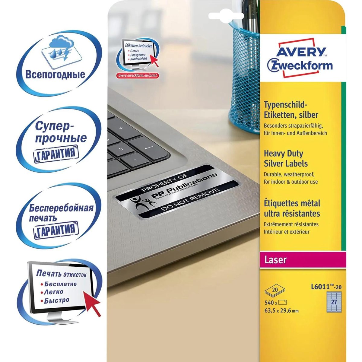 • Этикетки из прочной полиэстерной пленки серебристного цвета — идеальный вариант для маркировки инвентаря, электронных компонентов, указания паспортных данных, инвентарной описи.<br>• Масло-и УФ-стойкие, устойчивы к воздействию загрязняющих веществ, влаги, перепадов температуры (от −40°C до +150°C).<br>• Устойчивы к загрязняющим веществам, легко моются, если поверхность испачкана.<br>• Надежный клеевой состав, этикетки надежно приклеиваются на различные поверхности. <br>• Гарантия беспрепятственного прохождения листов через любой черно-белый лазерный принтер. <br>• Гарантированное запекание тонера и четкий отпечаток текста при печати на черно-белых лазерных принтерах.<br>• Профессиональное бесплатное программное обеспечение на русском языке для создания и печати этикетки.<br><br>Идеально подходят для стильной инвентарной маркировки на самых разнообразных поверхностях: маркировка дорогостоящего имущества и инвентаря, маркировка компьютерной и электробытовой техники, маркировка архивов и оборудования в офисах и банках.<br><br>Как создать серебристую этикетку всего за несколько шагов<br><br>Для оформления и печати этикеток рекомендуем использовать фирменное<b> программное обеспечение</b> от Avery. С его помощью возможно как простое редактирование текста на этикетке, так и создание креативных проектов и сложных дизайнов. Возможности программы: вставка картинок и объектов, импорт баз данных из файлов Excel, создание штрихкодов и матричных кодов, слияние данных для почтовой рассылки, создание серийных номеров. Вы найдете более 500 готовых дизайнов, графики, рисунков на любую тему.<br>Для того чтобы программа работала корректно, убедитесь, что у вас:<br>— установлена требуемая версия Adobe Flash Player (необходимо установить или обновить имеющуюся);<br>— удалены/почищены cookies в браузере, которым вы пользуетесь;<br>— либо попробуйте зайти с помощью другого браузера (Google Chrome или Mozilla Firefox).<br><br><br>