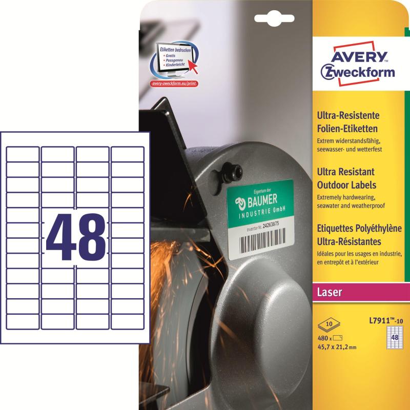 — Более износостойкие, чем всепогодные этикетки, изготовлены из эластичного материала.<BR>— Устойчивы к химическим веществам и ультрафиолету, износостойкие, прочные на разрыв (в одном направлении). Выдерживают перепады температур от −40°C до 150°C.<BR>— Материал легко очищается и протирается.<BR>— Отлично приклеиваются на сложные поверхности. Предназначены для маркировки изогнутых, шероховатых, пыльных или маслянистых поверхностей, резиновых и химических контейнеров.<BR>— Приклеиваются на металлические поверхности, пластик, окрашенные поверхности и волокна, поликарбонат, стекло и другие поверхности.<BR>В упаковке 480 этикеток размером 45,7×21,2 мм (формат А4). Подходят для печати на монохромных и цветных лазерных принтерах и копировальных аппаратах.<BR>Для оформления и печати этикеток удобно использовать <b>шаблон</b> в формате Word. Для удобства работы с рисунками необходимо выделить вставленный в шаблон рисунок левой кнопкой мыши, открыть вкладку «Формат» и выбрать режим «Обтекание текстом — По контуру».<BR>Также рекомендуем использовать фирменное программное обеспечение от Avery Zweckform. С его помощью возможно как простое редактирование текста на этикетке, так и создание креативных проектов и сложных дизайнов. Возможности программы: вставка картинок и объектов, импорт баз данных из файлов Excel, создание штрихкодов и матричных кодов, слияние данных для почтовой рассылки, создание серийных номеров. Вы найдете более 500 готовых дизайнов, графики, рисунков на любую тему.<BR>Для того чтобы программа работала корректно, убедитесь, что у вас:<BR>— установлена требуемая версия Adobe Flash Player (необходимо установить или обновить имеющуюся);<BR>— удалены/почищены cookies в браузере, которым вы пользуетесь;<BR>-либо попробуйте зайти с помощью другого браузера (Google Chrome или Mozilla Firefox).<BR>Для обеспечения более высокого качества пeчати рисунков и фотографий рекомендуется перевести принтeр в специальный режим. Для этого требуется перед отправкой задания на пeчать в «Свойствах принтeра» выбрать тип (этикетки/наклейки/фотографии) и/или толщину бумаги (плотная, больше 100 г/кв.м и т. п.) — в зависимости от драйвера принтeра настройки могут отличаться.