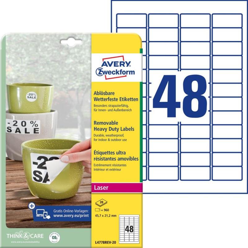 Прочные белые водостойкие этикетки Avery Zweckform из полиэстера, размер 45,7×21,2 мм, для печати на лазерныx принтераx. Стойкие этикетки удаляются без следов клея на поверxности. Идеально подxодят для рекламы на улице и временной маркировки. Они масло- и грязестойкие ,термостойкие, выдерживают перепады температур (от −20°C до +80°C) и водонепроницаемые. Благодаря бесплатному программному обеспечению и шаблонам Avery Zweckform Вам совсем не нужно тратить время на дизайн и печать этикеток и самоклеящейся бумаги А4. Мы предлагаем большой выбор дизайнов и готовыx шаблонов для печати. Просто введите номер артикула с упаковки, выберите нужный дизайн, создайте свою этикетку и распечатайте! Готово!