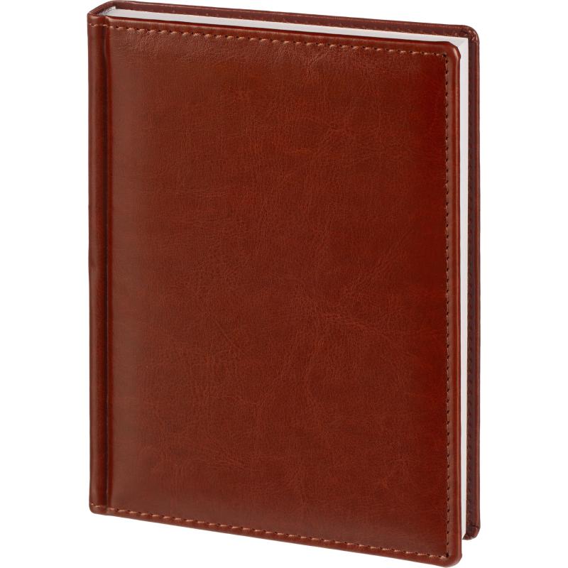 Ежедневник датированный Attache Agenda — это надёжный помощник для планирования и организации рабочего времени. Он идеально подходит для использования в офисе или на учёбе.<br><br>Данный ежедневник имеет формат A5, содержит 176 листов. Твёрдая обложка с поролоном, выполненная из высококачественной искусственной кожи коричневого цвета, придаёт изделию элегантный и профессиональный вид. Страницы выполнены из белой офсетной бумаги плотностью 70 г/кв.м. Дизайн обложки универсальный.<br><br>Тип крепления — сшивка. Печать блока в 2 краски. Вид линовки — линейка. Размер: 14.8×21.8 см.<br><br>Среди дополнительных характеристик — ляссе серебристого цвета и уникальный блок, выполненный в двух цветах. На страницах предусмотрен календарь на 2026-2027 гг., что позволяет удобно планировать мероприятия и торжественные даты.<br><br>Ежедневник содержит информационно-справочный блок, включая личные данные, праздники, дни рождения и полезные сервисы. Блок также оснащён местами для записи регулярных платежей, важных телефонов и различных измерений. Перфорация уголка упрощает использование и добавляет удобства.<br><br>Возможность нанесения логотипа на обложку любым способом тиснения открывает дополнительные возможности для корпоративного использования. Ежедневник Attache — отличный выбор для тех, кто ценит практичность и стиль в повседневной жизни.