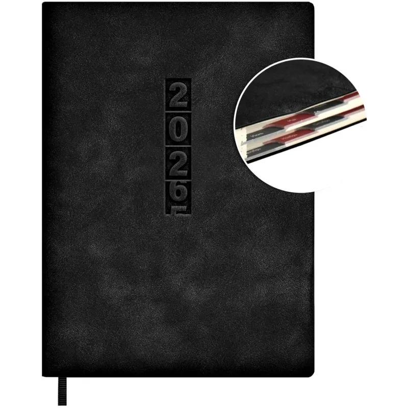 Ежедневник датированный Escalada, 2026 год, искусственная кожа, А6+, 176 листов, чёрный (чёрный обрез). Обложка: мягкий переплёт, запаянный край, блинтовое тиснение, обстрочка по периметру — нет, скруглённый корешок, прямые углы обложки.<br><br>Внутренний блок: ниткошвейный, кремовый офсет 70 г/кв.м, печать в две краски (линия), прямые углы блока, перфорация углов блока — есть, справочный материал — есть. Красочность форзаца: печать пантоном.<br><br>Закладка: одно ляссе. Каптал: есть. Особенности: вырубка блока по месяцам, в блоке использованы мотивирующие высказывания экстраординарной личности, предпринимателя и миллиардера, титулованного «Провидца века», шоумена и телеведущего, бывшего владельца конкурса красоты «Мисс Вселенная» и дважды президента США — Дональда Трампа.<br><br>Индивидуальная упаковка: промостикер + ПЭТ-пакет.