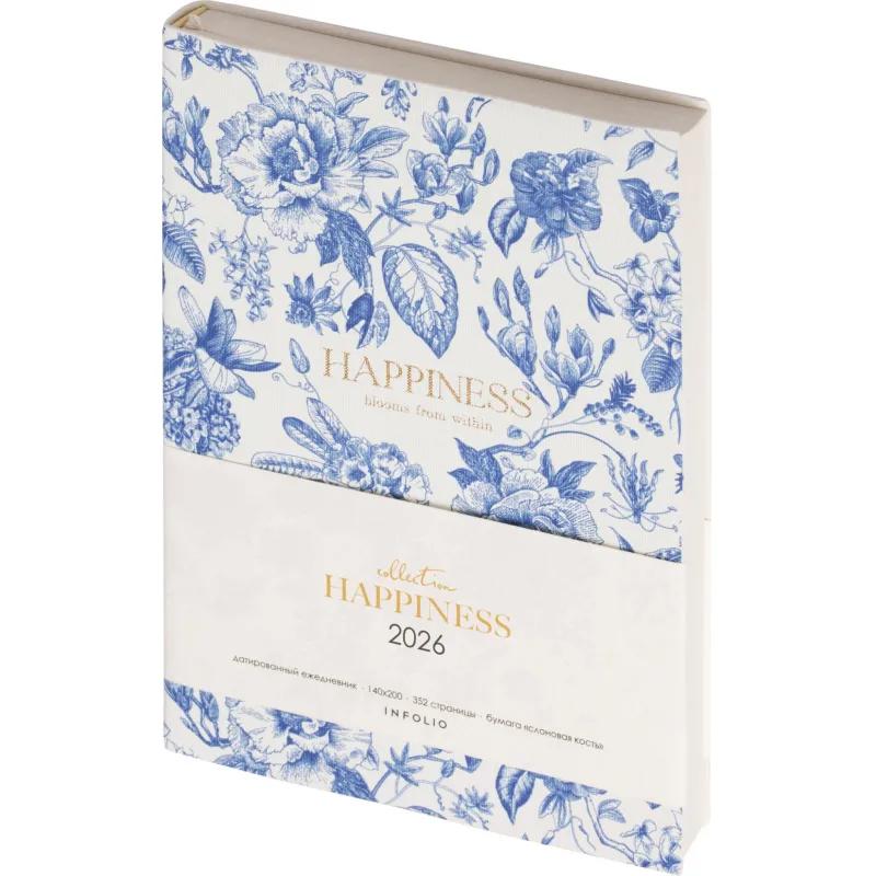Ежедневник датированный InFolio Happiness — воплощение стиля и утончённости. Вдохновлённая популярной винтажной посудой, она гармонично впишется в современную жизнь, станет верным помощником и прекрасным аксессуаром. Почувствуйте роскошь, привнесите красоту в каждый день, позвольте каждой странице стать частью вашей жизни!<br><br>Удобный датированный на 2026 год ежедневник формата A5 (140×200 мм) будет не только незаменимым помощником в ведении дел, но и стильным аксессуаром, отражающим индивидуальность владельца.<br><br>Мягкая обложка из приятной искусственной кожи с цветной печатью и тиснением фольгой имеет удобный кармашек для мелочей на задней части. А благодаря крепкому ниткошвейному скреплению ежедневник верно прослужит весь год.<br><br>Датированный внутренний блок в линейку на 176 листов (352 страницы) из высококачественной бумаги цвета слоновой кости плотностью 70 г/кв.м. Информационный блок ежедневника включает титульный лист, календари на 2026-2027 гг., раздел «планы на год», развороты для заметок в начале и конце блока, а также планер перед каждым месяцем.<br><br>В ежедневнике также имеются две удобные атласные закладки, которые помогут быстро найти нужные развороты.