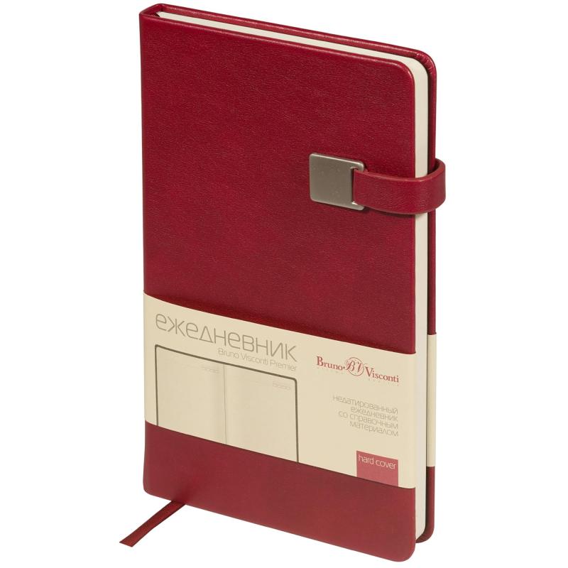 Ежедневник недатированный Bruno Visconti Premier формата A5 — это элегантный и практичный аксессуар с твёрдой обложкой из высококачественной искусственной кожи бордового цвета. Обложка дополнена металлическим хлястиком на магните. Ляссе в цвет обложки позволяет быстро находить нужные страницы, а перфорированные и скруглённые углы блока делают использование ежедневника ещё более удобным.<br><br>Внутренний блок состоит из 272 страниц бежевой офсетной бумаги плотностью 70 г/кв.м. и включает раздел с 19 страницами справочной информации. Линовка с линиями позволяет легко организовать записи и планировать дни.<br><br>Этот ежедневник подходит для персонализации.