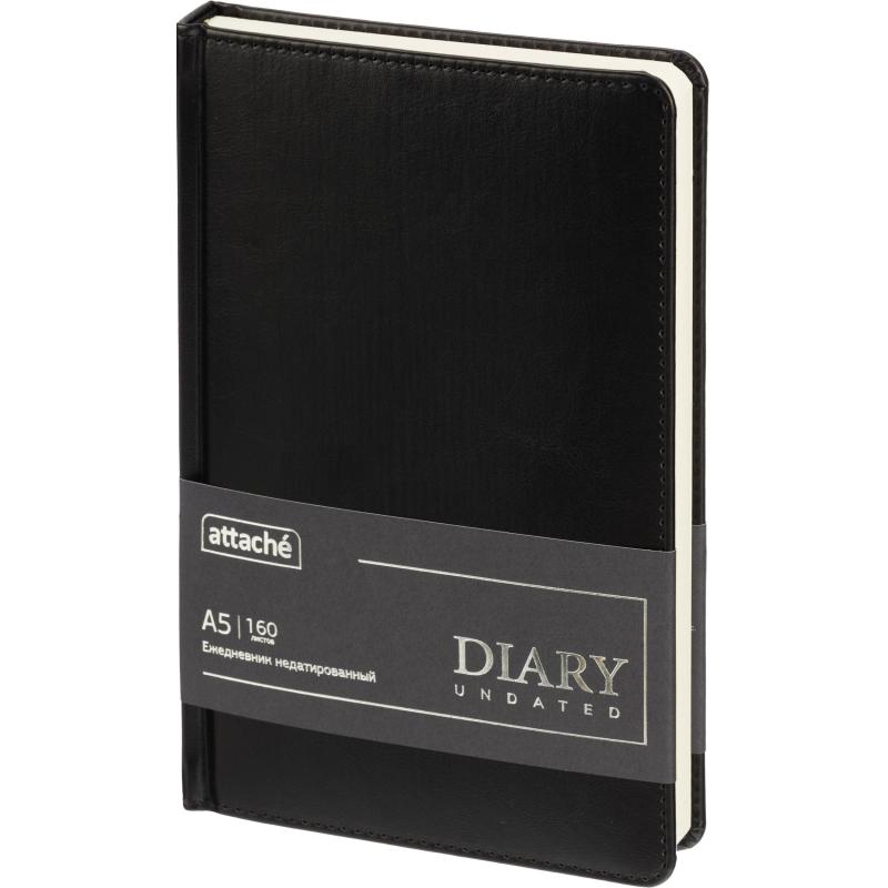 Ежедневник недатированный Attache, формата A5 подойдёт для ведения деловых записей, планирования задач и заметок. Он содержит 160 листов из тонированной офсетной бумаги плотностью 80 г/кв.м. Линовка в линейку и печать в две краски обеспечивают удобство при заполнении и хорошую читаемость текста.<br><br>Обложка выполнена из чёрной искусственной кожи, оформлена тиснением и дополнена прочной прострочкой по периметру. Твёрдый переплёт и сшивка гарантируют износостойкость. Скруглённые углы, вырубка и перфорация уголков делают использование комфортным. Ежедневник оснащён ляссе и календарём на два года. Подходит под персонализацию.<br><br>Размер изделия — 13.8×21.3 см.