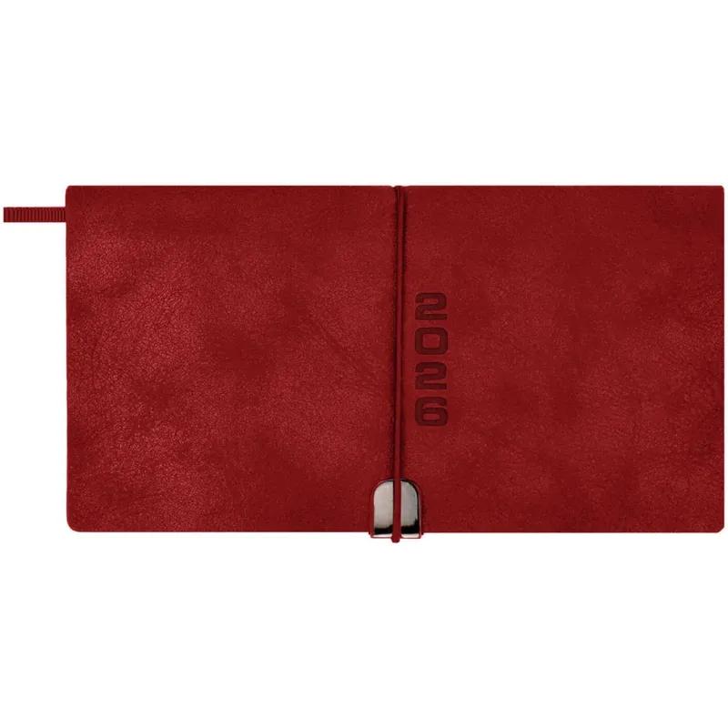 Еженедельник датированный Escalada, на 2026 год, искусственная кожа, размер 175×95 мм, 64 листа, красный с фиксирующей резинкой. Обложка: мягкий переплёт, блинтовое тиснение, обстрочка по периметру — нет, скруглённый корешок, прямые углы обложки.<br><br>Внутренний блок: ниткошвейный, белый офсет 70 г/кв.м, печать в одну краску (линия), прямые углы блока, перфорация углов блока — нет, справочный материал — есть. Красочность форзаца: печать пантоном. Закладка: одно ляссе. Каптал: нет. Особенности: застёжка-резинка. Индивидуальная упаковка: ПЭТ-пакет.