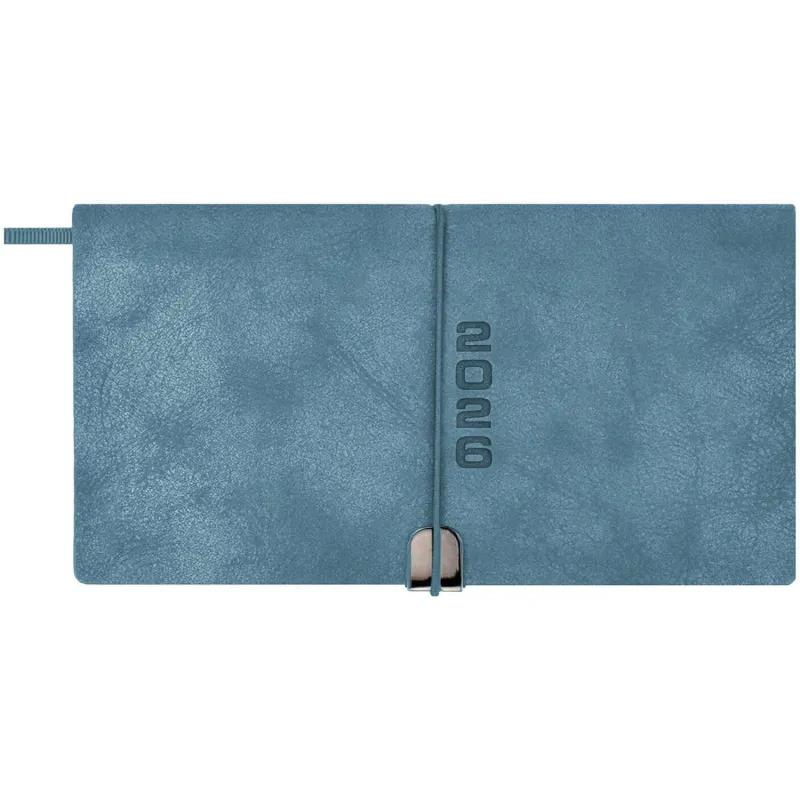 Еженедельник датированный Escalada, на 2026 год, искусственная кожа, размер 175×95 мм, 64 листа, голубой с фиксирующей резинкой (голубой обрез). Обложка: мягкий переплёт, блинтовое тиснение, обстрочка по периметру — нет, скруглённый корешок, прямые углы обложки.<br><br>Внутренний блок: ниткошвейный, белый офсет 70 г/кв.м, печать в одну краску (линия), прямые углы блока, перфорация углов блока — нет, справочный материал — есть. Красочность форзаца: печать пантоном. Закладка: одно ляссе. Каптал: нет. Особенности: застёжка-резинка. Индивидуальная упаковка: ПЭТ-пакет.