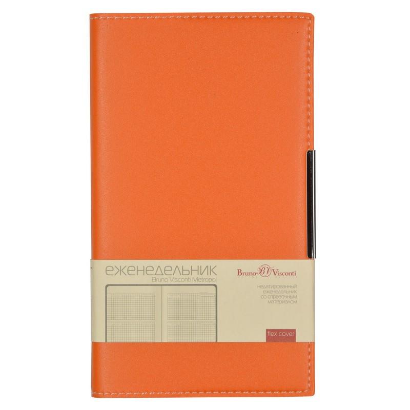 Еженедельник недатированный Bruno Visconti Metropol — практичный недатированный еженедельник в мягкой обложке выполнен из искусственной кожи. Контрастная прострочка белыми нитками по периметру привлекает внимание к изящной форме обложки с закруглёнными уголками. Обложка в универсальном офисном стиле формата A6 украшена металлическим шильдиком. Размер еженедельника — 102×177 мм.<br><br>Блок состоит из 160 страниц, сделанных из бежевой бумаги плотностью 70-90 г/кв.м. На 18 первых страницах размещена справочная информация с ценными сведениями из разных областей. Линовка блока — клетка, с указанием дней недели.<br><br>Карманный формат позволяет эффективно вести записи на выездных совещаниях, переговорах и встречах. Еженедельник также подходит для персонализации.