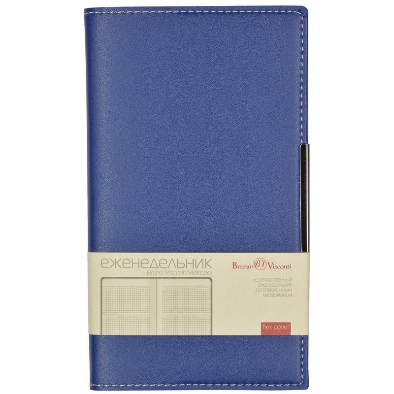 Еженедельник недатированный Bruno Visconti Metropol — практичный недатированный еженедельник в мягкой обложке выполнен из искусственной кожи. Контрастная прострочка белыми нитками по периметру привлекает внимание к изящной форме обложки с закруглёнными уголками. Обложка в универсальном офисном стиле формата A6 украшена металлическим шильдиком. Размер еженедельника — 102×177 мм.<br><br>Блок состоит из 160 страниц, сделанных из бежевой бумаги плотностью 70-90 г/кв.м. На 18 первых страницах размещена справочная информация с ценными сведениями из разных областей. Линовка блока — клетка, с указанием дней недели.<br><br>Карманный формат позволяет эффективно вести записи на выездных совещаниях, переговорах и встречах. Еженедельник также подходит для персонализации.