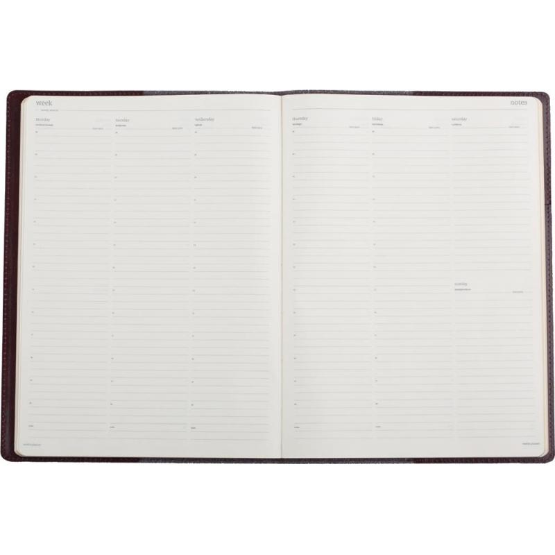 Еженедельник недатированный Bruno Visconti Profy — необходимый инструмент на столе делового человека, стремящегося к карьерному и личностному росту. Мягкая обложка в универсальном офисном стиле выполнена из высококачественной рециклированной коричневой натуральной кожи, подходящей для любых видов полиграфического тиснения. Матовая поверхность кожи подчёркнута золотым металлизированным обрезом. По периметру обложки проходит строчка нитками в тон.<br><br>Еженедельник со сменным блоком выпускается в настольном формате A4 (размер: 210×290 мм) и состоит из 128 страниц. Для них использована бежевая бумага высшего сорта, обладающая плотностью 70-90 г/кв.м. На 18 страницах размещена справочная информация с полезными сведениями из различных областей. Под обложкой расположена кожаная петля для ручки, что делает еженедельник удобным для поездок. Есть специальный карман для хранения визиток.