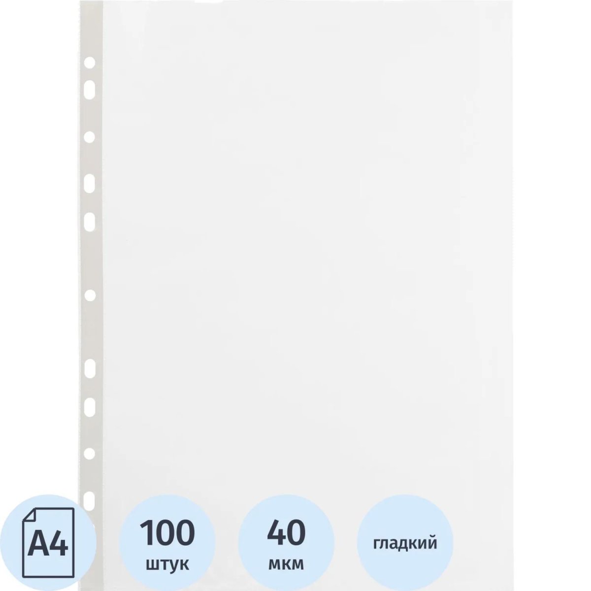 Файл-вкладыш Attache А4 40 мкм гладкий с перфорацией (100 штук в упаковке)<br><br>Файл-вкладыш Attache формата А4, предназначенный для хранения и защиты печатных документов. Поверхность прозрачная, глянцевая. Изготовлен из полипропиленовой пленки (толщина 40 мкм). Боковая перфорация подходит для разных типов скоросшивателей. В упаковке содержится 100 файлов. Каждый файл-вкладыш вмещает около 50 листов стандартной плотности.