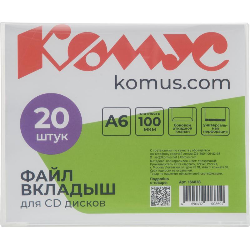 Файл-вкладыш 'Комус' предназначен для хранения компакт-дисков. Рассчитан на один CD или DVD. Изготовлен из прозрачной полипропиленовой пленки толщиной 100 мкм. Размер 130х120 мм. Поверхность рифленая. Файл обеспечивает защиту диска от царапин и загрязнения. Имеет перфорацию (2 отверстия) для архивирования в папки. В упаковке содержится 20 файлов-вкладышей. Стоимость указана за упаковку.
