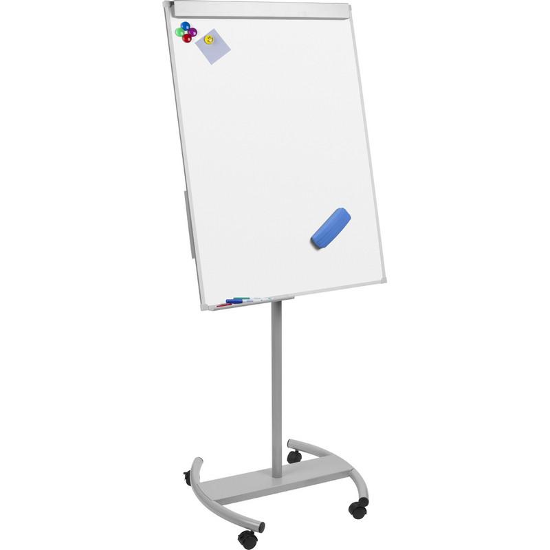 Мобильный флипчарт на роликах с магнитно-маркерным покрытием. Флипчарты являются эффективными и удобным средством для презентации, конференций. Предназначен для работ маркерами сухого стирания и размещения информации с помощью магнитов. Рамка из анодированного алюминия и пластиковые уголки. Держатель для бумажного блока на винтах. Стильная мобильная подставка стального цвета на колесиках. Ролики с фиксатором. В комплект поставки входит лоток для маркеров. Размер поверхности 70x100. Высота 185 см. Флипчарт используется только вертикально. Угол наклона изменить нельзя По поверхности флипчарта рекомендуется писать маркерами для досок. По поверхности блока бумаги рекомендуется писать маркерами для флипчартов.<br>Страна производитель - Россия.<br>Гарантия 1 год.<br>Размер основания 55x60 см.<br>Между колесами на одной дуге 50 см, на разных дугах 35 см. Для удаления пленки потяните за верхний свободный угол, пленка легко отойдет от рабочей поверхности. При необходимости проведите вдоль рамы канцелярским ножом. Основание к стойке крепится болтом 14x60, а доска к стойке с помощью двух гаек м8.