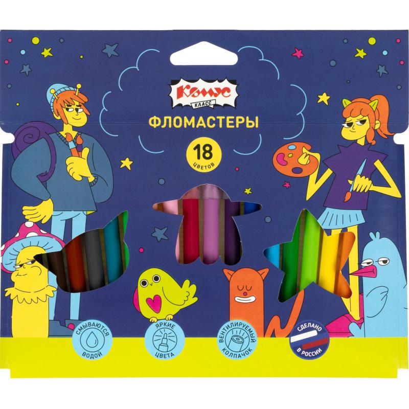 Фломастеры Комус Класс Максики 18 цветов с вентилируемыми колпачками смываемые <br> <br> Набор фломастеров «Максики» — это отличный выбор для детского творчества. В наборе 18 ярких и насыщенных цветов, которые помогут ребёнку создавать красочные рисунки. <br> <br> Корпус фломастеров изготовлен из прочного пластика, что обеспечивает долговечность и надёжность. Вентилируемый колпачок соответствует международным стандартам безопасности, что важно для родителей. Фиксированный пишущий узел не даст стержню провалиться даже при сильном нажатии, что делает эти фломастеры удобными и практичными в использовании. <br> <br> Фломастеры предназначены для детей от 3 лет. Поставляются в картонной упаковке с европодвесом, что облегчает их хранение и транспортировку.