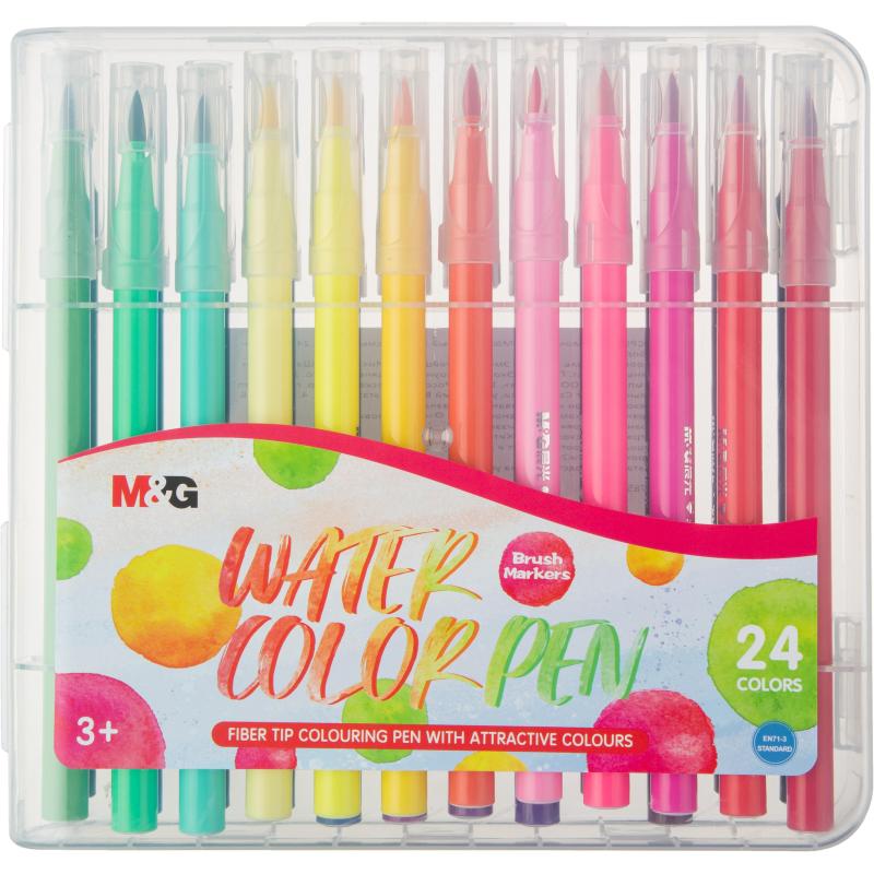 Фломастеры M&G 24 цвета с вентилируемыми колпачками смываемые (ACP901CD)<br> <br> Цветные фломастеры предназначены для рисования на бумаге. Благодаря водной основе они легко смываются с большинства материалов и кожи. Толщина линии письма — 1-5 мм. Вентилируемый колпачок надёжно защищает фломастер от высыхания, а также обеспечивает безопасность при использовании ребёнком (не перекрывает доступ кислорода в случае попадания в дыхательные пути). Рекомендуются для детей от 3 лет. Поставляются в пластиковом боксе, который делает удобным использование и хранение, незаметно приучая ребёнка поддерживать порядок на рабочем месте. Размер упаковки: 190×180×10 мм.