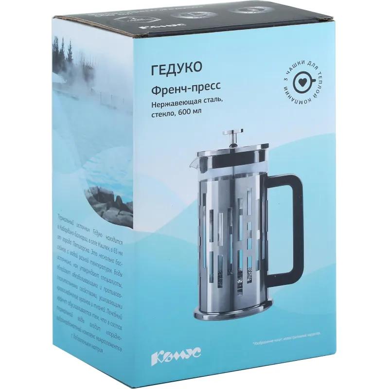 Френч-пресс сделан из термостойкого силикатного стекла, высококачественной нержавеющей стали 18/10 и пищевого пластика. <br>Утолщённый ободок колбы повышает прочность и продлевает срок службы изделия. <br>Форма края носика препятствует образованию подтёков. <br>Удобная не нагревающаяся бакелитовая ручка. <br>Усовершенствованный пресс-механизм: навитая пружина способствует более плотному прилеганию краёв фильтра к стенкам колбы и предохраняет его от деформации. <br>Оптимальный размер ячеек фильтра обеспечивает идеальную фильтрацию напитка. <br>Благодаря теплоизоляционным свойствам устойчивое основание защищает поверхность от повреждений.<br>Можно мыть в посудомоечной машине при температуре не выше 65 градусов. Для сохранения наилучшего внешнего вида френч-пресса рекомендуется ручная мойка.<br>Размер: 13.5×10×20 см. <br>Объём: 600 мл. <br>Тип упаковки: картонная коробка. <br>Избегайте резких перепадов температур: не наливайте кипяток в холодный стеклянный чайник и не охлаждайте горячий холодной водой. Резкие перепады температур могут привести к повреждению изделия. Нельзя ставить горячий чайник на холодные поверхности и доливать холодную воду сразу после кипячения. Перед заливкой кипятка прогрейте чайник теплой водой.