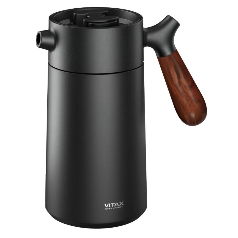 <nobr>Френч-пресс</nobr> Vitax 950 мл (<nobr>VX-3070</nobr>). <BR>Вакуумный <nobr>френч-пресс</nobr> для приготовления горячих и холодных напитков. Благодаря уникальному дизайну, данная модель подходит для хранения напитков. Конструкция двойной вакуумной колбы корпуса и клапанная система открывания, обеспечивают условия, при которых напитки внутри <nobr>френч-пресса</nobr> могут долго оставаться горячими или холодными (до <nobr>9-ти</nobr> часов и до <nobr>19-ти</nobr> часов, соответственно). <BR>Материал: корпус из нержавеющей стали AISI SS30408 имеет защитное покрытие; верхняя часть корпуса, крышка и ручка поршня — термостойкий пищевой пластик; уплотнители — пищевой, износостойкий силикон; фильтр съемный — пищевой, термостойкий полиамид; сетка — нержавеющая сталь AISI SS30408. <BR>Особенности: <BR>— Максимальная фильтрация напитков — сетка с ячейкой менее 0,1 мм.<BR>— Широкая горловина (8,5 см) — удобный уход и эксплуатация изделия. <BR>— Защита дна — противоскользящий протектор из силикона. <BR>Объем — 950 мл. <BR>Диаметр — 8,5 см. <BR>Высота — 25 см. <BR>Упаковка: картонная коробка. <BR>Размер упаковки: 17×17×26 см. <BR>Не подходит для мытья в посудомоечной машине.