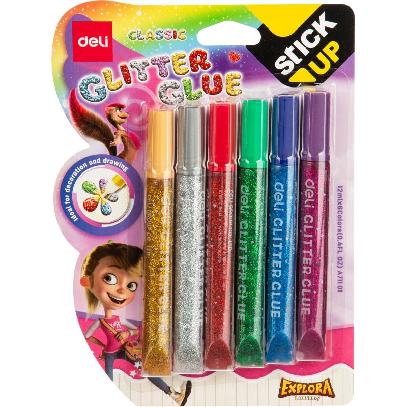 Глиттер гель DELI Explora с яркими цветными блестками придает эффект мерцания и превосходно подходит для декорирования рисунков, поздравительных открыток, иллюстраций, тетрадей, плакатов, игрушек, поделок, свечей и прочих изделий из различных материалов: бумаги, дерева, пластика, стекла, воска <nobr>и т. д.</nobr> <BR><BR>Удобный наконечник для точного нанесения клея. Без растворителей. Легкосмываемый. Подходит для слаймов. <BR>Рекомендации по применению: перед началом работы снимите колпачок с тубы и нанесите гель на декорируемую поверхность. По окончании работы прочистите наконечники каждой тубы и плотно закройте колпачки. В течение трех часов основной состав геля высохнет, а на декорируемой поверхности останутся искрящиеся блестки. Время высыхания геля зависит от толщины нанесенного слоя. Берегите гель от замерзания. Гель легко смывается с рук и одежды теплой водой с мылом. <BR>В наборе: 6 шт. <BR>Для детей старше <nobr>3-х</nobr> лет.<BR>Объем: 12 мл.