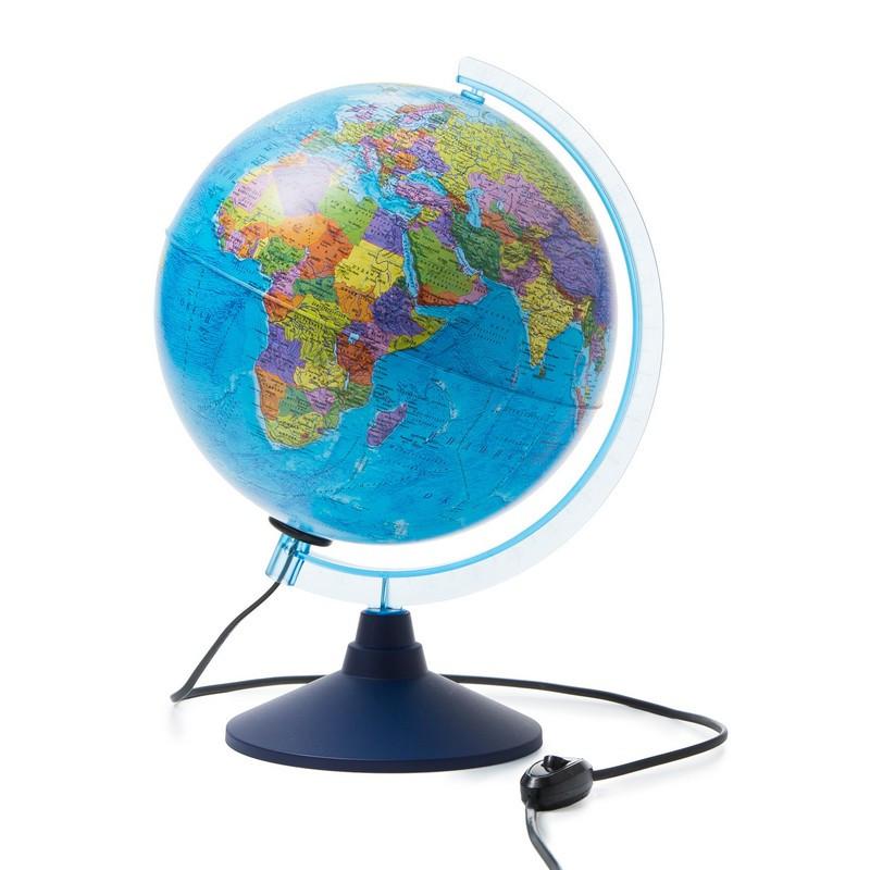 Глобус Globen Классик Евро политический 25 см с подсветкой<br> <br> Глобус — идеальное учебное пособие для изучения географии в школе и дома. Сфера изготовлена из пластика. Диаметр сферы 25 см. Устойчивая настольная подставка из пластика. Карта максимально подробная для данного диаметра глобуса. Линия экватора выпуклая для тактильного восприятия. Изображение карты соответствует принятым мировым картографическим стандартам условного обозначения ландшафта и стран. Наличие подсветки позволяет использовать глобус как ночник в вечернее и ночное время. Размер глобуса: 37×28 см. Питание от сети, в комплекте поставляется шнур с выключателем.