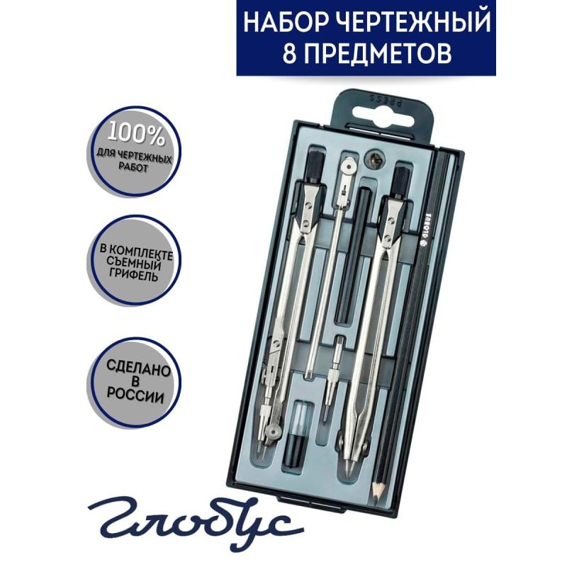 Готовальня Глобус Technica предназначена для чертёжных и графических работ и подходит для профессионального и учебного использования. В комплект входят чертёжный циркуль длиной 155 мм из нержавеющего металла, запасной винт, циркуль разметочный, держатель, запасной грифель, карандаш чернографитный, карандашная вставка, удлинитель. Все элементы выполнены из металла с серебристым покрытием. Циркуль оснащён одной сгибаемой штангой, что обеспечивает удобство и точность работы. Набор упакован в пластиковый пенал с европодвесом, что делает его удобным для хранения и транспортировки.