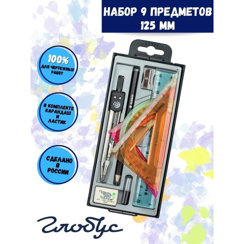 Готовальня Глобус Junior предназначена для чертёжных и графических работ, идеально подходящая для учебного использования. В комплект входят чертёжный циркуль длиной 125 мм из нержавеющего металла, пенал с запасным грифелем, чернографитный карандаш, точилка, ластик, треугольники с углами 30° и 45°, транспортир и линейка длиной 15 см. Циркуль оснащён несгибаемыми штангами. Все элементы набора выполнены из металла с серебристым покрытием и качественных материалов для аксессуаров. Набор упакован в пластиковый пенал с европодвесом, который удобен для хранения и транспортировки.