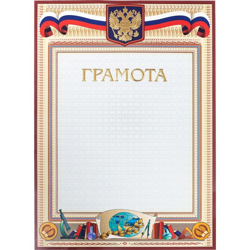 Грамота А4 230 г/кв.м с тиснением фольгой (А4-23/Г). Бланк выполнен в классическом торжественном дизайне. В верхней части расположены российский герб и флаг с тиснением, выполненным с использованием золотой, цветной и дифракционной фольги. Это придает документу официальность и значимость. Грамота оформлена в школьной тематике. Она предназначена для награждения за особые заслуги в учебной и научной деятельности школьников и студентов. Отпечатана на импортном мелованном картоне плотностью 230 г/кв. м. Размер бланка 210×290 мм позволяет напечатать на нем текст с помощью стандартного принтера.