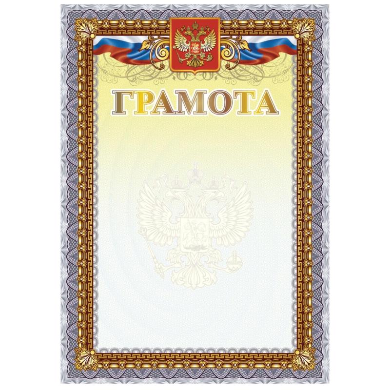 Грамота А4 250 г/кв. м с тиснением фольгой (10 штук в упаковке, КЖ-1623). Бланк выполнен в классическом стиле. Он имеет ажурную разноцветную рамку в сдержанных тонах и светло-желтый фон с узором. В верхней части расположен государственный герб, придающий документу официальность и значимость. Надпись Грамота выполнена тиснением золотой фольгой. Предназначена для награждения за заслуги в учебе, спорте, трудовой деятельности, а также для выражения признательности и благодарности сотрудникам, коллегам и партнерам. Бланк отпечатан на мелованной бумаге плотностью 250 г/кв. м. Подходит для печати на принтере. Формат — А4. В упаковке 10 шт.