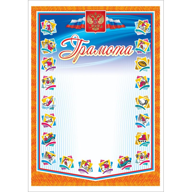 Грамота спортивная А4 250 г/кв. м (10 штук в упаковке, КЖ-901). Бланк выполнен в спортивной тематике. Он имеет оранжевую рамку с окантовкой в виде триколора и светлый фон с узором. В верхней части расположены государственный герб и триколор, придающие документу официальность и значимость. Для украшения использованы красочные изображения различных видов спорта, таких как плавание, бег, футбол и другие, что подчеркивает тематику грамоты. Надписи напечатаны краской. Грамота предназначена для награждения за достижения в спортивных соревнованиях и трудовой деятельности в области спорта, а также для выражения признательности и благодарности тренерам. Она отлично подойдет для общеобразовательных школ, лицеев, гимназий, детских садов, летних лагерей, спортивных школ и вузов. Бланк отпечатан на мелованной бумаге плотностью 250 г/кв. м. Подходит для печати на принтере. Формат — А4. В упаковке 10 шт.