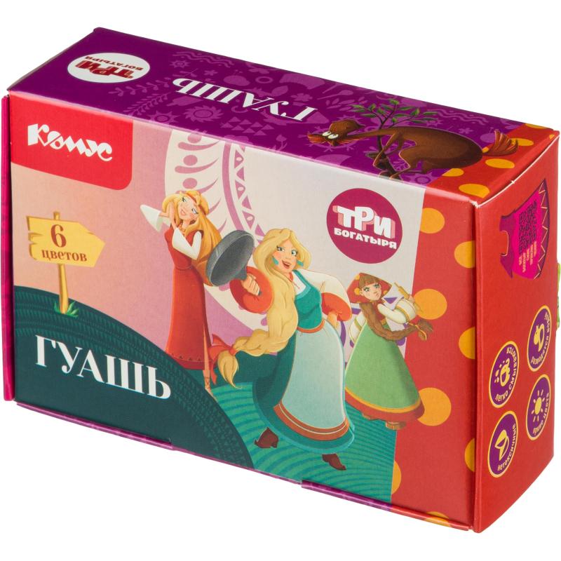 Гуашь Комус Три Богатыря 6 цветов по 20 мл девочки <br><br>Отличает высокая кроющая способность краски. Цвета насыщенные, глубокие, отлично перекрываются и образуют матовую бархатистую поверхность по мере высыхания краски. При этом сохраняется яркость и насыщенность тона, краски ложатся ровно, не осыпаются. Хорошо разводится и размывается водой, легко набирается на кисть. Краски упакованы в цветную картонную коробку, размер упаковки: 117×77×40мм. Объем одной баночки — 20 мл. Поставляется без кисти.