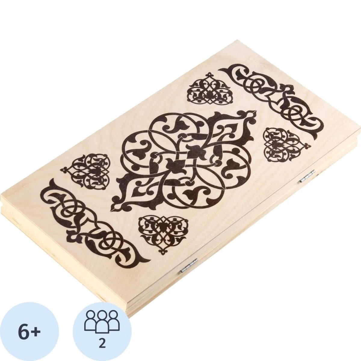 Игра Take it easy Нарды деревянные Узор<br><br>Нарды деревянные с орнаментом представляют собой складной кейс с металлическими замками. Изделие изготовлено из натурального дерева. Размер доски в разложенном виде составляет 40×40 см. Рисунок нанесён методом прямой печати, что придаёт оформлению устойчивость и чёткость. На внутренней стороне кейса расположено поле для игры в нарды, а одна из внешних сторон оформлена как игровое поле для шашек и шахмат.<br><br>Игра предполагает перемещение деревянных фишек по определённому маршруту в соответствии с результатами бросков кубиков. Цель — первым вывести все свои фишки с поля. Возможны разные варианты правил: длинные и короткие нарды. Дополнительное поле расширяет игровые возможности, позволяя использовать набор также для классических шашек или шахмат.<br><br>Набор рекомендован для детей старше 6 лет и взрослых. Предназначен для двух игроков. Средняя продолжительность партии составляет 20–30 минут.<br><br>Состав набора:<br>1. Деревянный кейс с рисунком и замками — 1 шт.;<br>2. Игровое поле для нард, шашек и шахмат;<br>3. Деревянные фишки — 30 шт.;<br>4. Игральные кости — 2 шт.