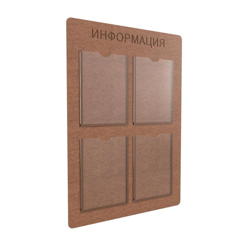 Информационный стенд Комус Информация выполнен из экологичной ХДФ, древесноволокнистой плиты высокой плотности с карманами А4 с кантом, который нанесен методом шелкографии.<BR>Рекомендуем повесить настенный стенд возле ресепшн.<BR>Размер: 600×850 см.<BR>Четыре плоских кармана А4.<BR>Крепится изделие на винты, гвозди и петли. Петли расположены в верхней части стенда.