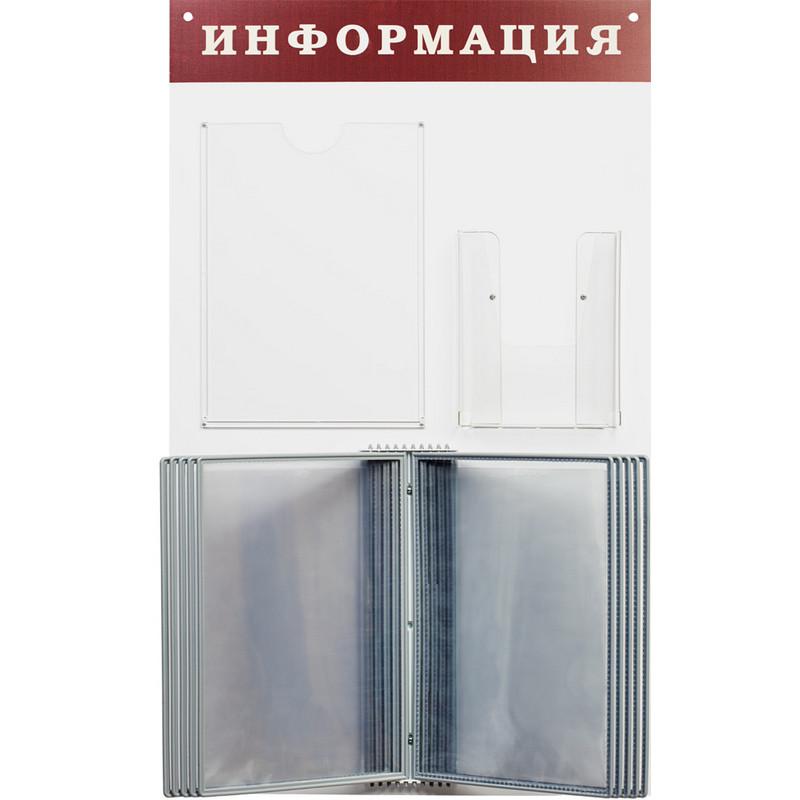 <p>Информационный настенный стенд «Информация» предназначен для размещения информации для покупателей, посетителей, сотрудников <nobr>и т. д.</nobr> Изготовлен из матового пластика белого цвета, размер — 48×80 см. Аппликация букв выполнена <nobr>темно-вишневой</nobr> пленкой. На стенде размещены прозрачные карманы формата А4 (под один лист) и формата А5 (объемный) глубиной 30 мм, а также перекидная демосистема на 10 панелей. В комплект входят крепежные элементы.</p>