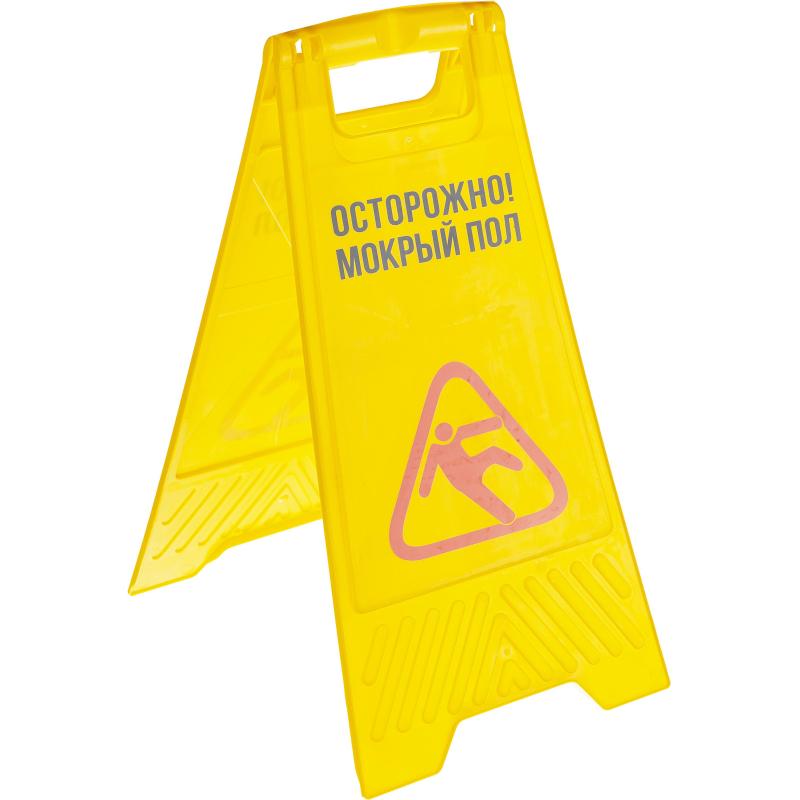 Раздвижная напольная информационная табличка Осторожно Мокрый пол представляет собой 2 панели с надписями, соединенными в верхней части. Предназначена для привлечения внимания и предупреждения людей, при проведении влажной уборки пола. Изготовлена из пластика желтого цвета. На внешней стороне каждой из двух пластин таблички, также есть упреждающие картинки. Устойчива на любом полу. Занимает мало места при хранении. <br>Размер таблички в сложенном виде: 300×630 мм. <br>Вес: 580 г.
