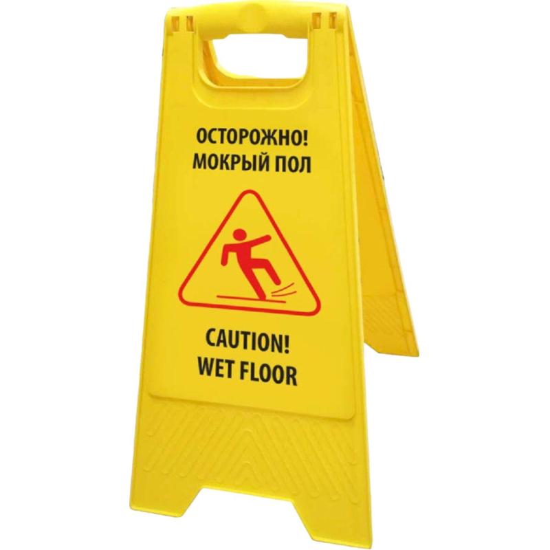 <p>Информационная табличка «Осторожно! Мокрый пол» (620×290 мм).<br />Табличка предупреждающая служит для предотвращения несчастных случаев в зонах проведения влажной и мокрой уборки.<br />Материал таблички: 100% полипропилен.<br />Табличка яркого желтого цвета привлекает внимание. Надпись выполнена на <nobr>2-х</nobr> языках (русский, английский), кроме надписи на табличку нанесен предупреждающий символ красного цвета.<br />Табличка легкая, складная, занимает мало места при хранении. Конструкция таблички предусматривает: фиксированный угол раскрытия для легкой установки; рукоятку для транспортировки и переноса таблички.<br />Размер таблички: 62×29×3 см.<br />Вес: 665 г.</p>