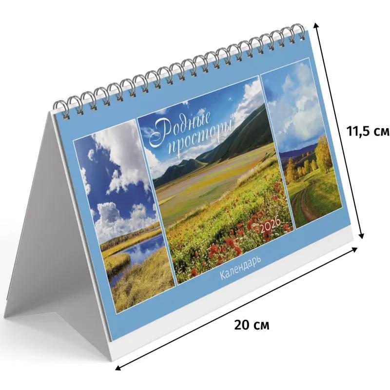 Календарь-домик настольный Контэнт «Родные просторы» — на 2026 год размером 20×11.5 см. Настольный календарь на 2026 год. Формат 200×115 мм, 12 листов + 2 обложки, мелованная бумага, разрезная сетка, курсор, пружина. Подложка — мелованный картон, место для рекламы 200×25 мм.<br><br>Пейзажи российской природы.