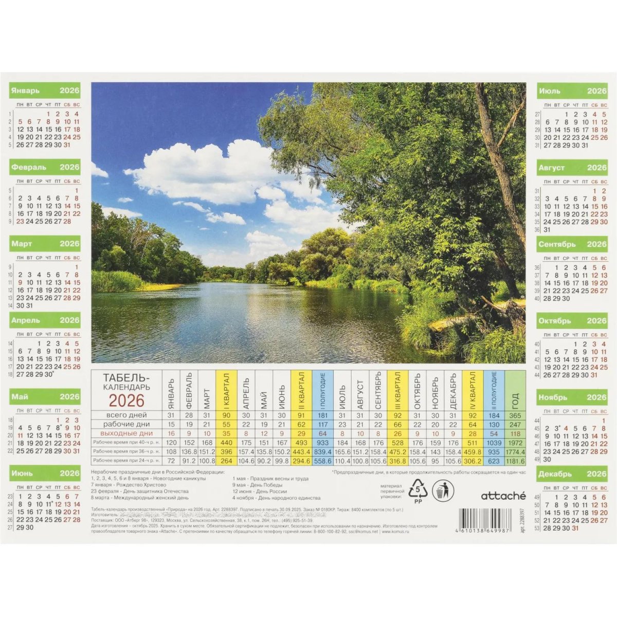 Календарь листовой Attache «Природа» — листовой календарь с табельной сеткой на 2026 год, выполненный в формате 290×220 мм.<br><br>Изготовлен из мелованного картона плотностью 220 г/кв.м и имеет отделку УФ-лаком.