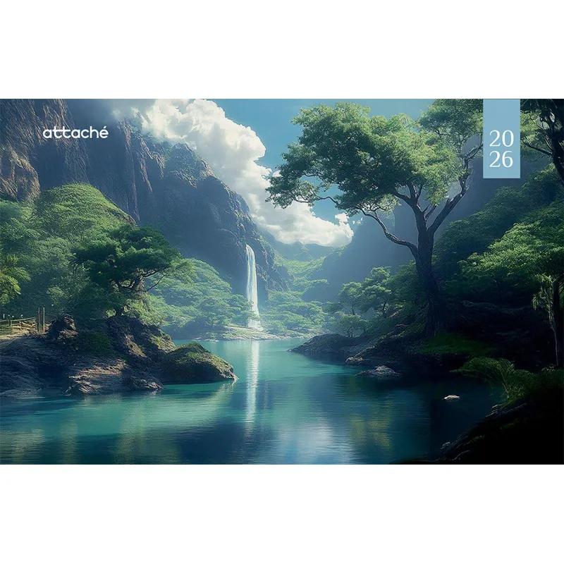 Календарь настенный трёхблочный Attache «Водопад» 2026, настенный трёхблочный отрывной календарь. Общий размер календаря — 305×675 мм. Шпигель — форматом 305×195 мм, изготовлен из мелованного целлюлозного картона. Блок — форматом 290×140 мм, изготовлен из офсетной бумаги 80 г, печать в 2 цвета. Крепление: каждая секция на металлическом гребне, с бегунком и люверсом, индивидуальная упаковка.