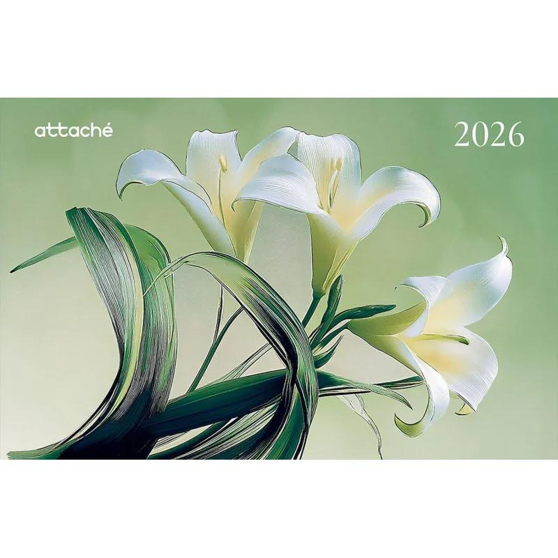 Календарь настенный трёхблочный Attache 2026 «Букет лилий», общий размер календаря — 305×780 мм. Шпигель форматом 305×195 мм, мелованный картон 300 г/кв.м. Блок форматом 290×140 мм, офсетная бумага 80 г, печать в 2 цвета. Крепление: каждая секция на металлическом гребне с бегунком и люверсом. Индивидуальная упаковка. Полноцветные подложки (плотный картон 300 г/кв.м.) составляют со шпигелем единый дизайн.