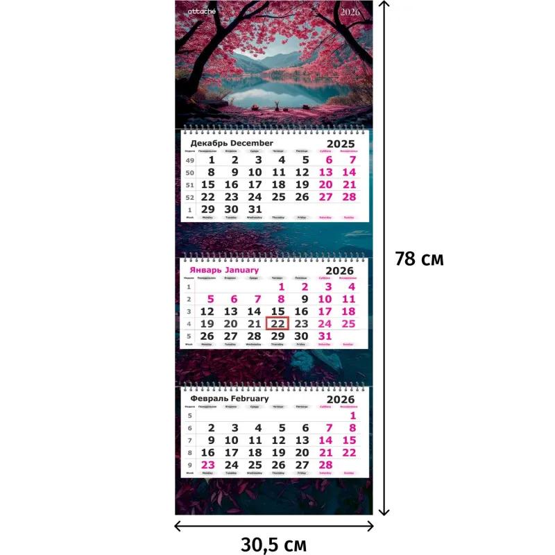 Календарь настенный трёхблочный Attache 2026 «Ветки в цвету», общий размер календаря — 305×780 мм. Шпигель форматом 305×195 мм, мелованный картон 300 г/кв.м. Блок форматом 290×140 мм, офсетная бумага 80 г, печать в 2 цвета. Крепление: каждая секция на металлическом гребне с бегунком и люверсом. Индивидуальная упаковка. Полноцветные подложки (плотный картон 300 г/кв.м.) составляют со шпигелем единый дизайн.
