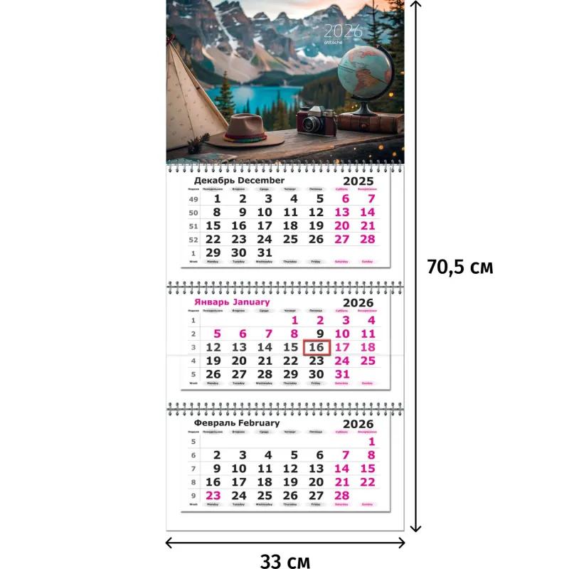 Календарь настенный трёхблочный Attache «Путешествия» размером 33×70.5 см. Настенный трёхблочный календарь. Формат блока 290×140 мм, изготовлен из офсетной бумаги 80 г, печать в 2 цвета.<br><br>Обложка: шпигель, формат 330×225 мм, изготовлен из мелованного картона 300 г/кв.м. Крепление — на трёх гребнях. Общий размер календаря 330×705 мм.<br><br>Дополнительно: с бегунком и люверсом, индивидуальная упаковка.
