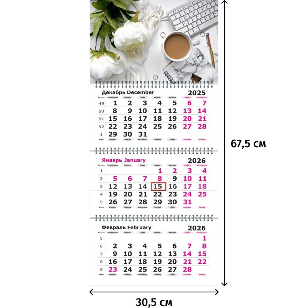 Календарь настенный трёхблочный Attache «Офис» 2026, размер 30.5×67.5 см, настенный трёхблочный отрывной календарь. Общий размер календаря — 305×675 мм. Шпигель — форматом 305×195 мм, изготовлен из мелованного целлюлозного картона. Блок — форматом 290×140 мм, изготовлен из офсетной бумаги 80 г, печать в 2 цвета. Крепление: каждая секция на металлическом гребне, с бегунком и люверсом, индивидуальная упаковка.