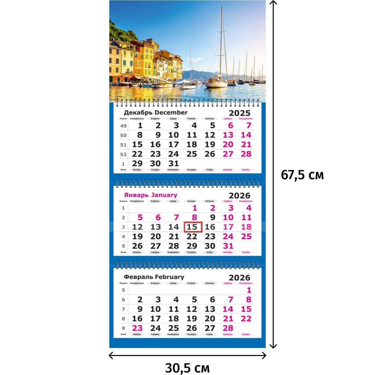 Календарь настенный трёхблочный Attache «Яхты на море» 2026, настенный трёхблочный отрывной календарь. Общий размер календаря — 305×675 мм. Шпигель — форматом 305×195 мм, изготовлен из мелованного целлюлозного картона. Блок — форматом 290×140 мм, изготовлен из офсетной бумаги 80 г, печать в 2 цвета. Крепление: каждая секция на металлическом гребне, с бегунком и люверсом, индивидуальная упаковка.