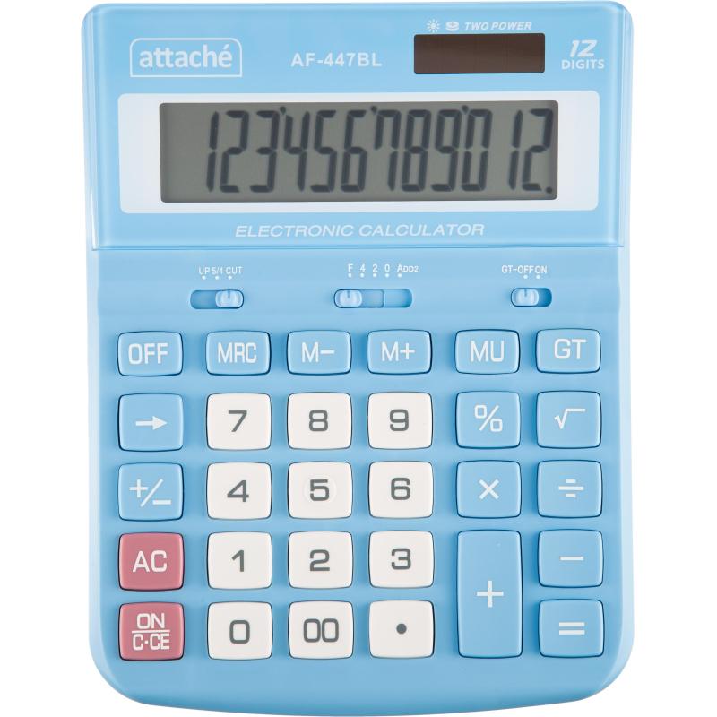 Калькулятор Attache полноразмерный настольный AF-447BL настольный с 12-разрядным ЖК-дисплеем.<br> Эргономичная форма панели и крупные клавиши создают максимальный комфорт в использовании. Корпус изготовлен в голубом цвете с кнопками белого цвета. Оптимальный и необходимый набор функций, среди которых: MC, MR, M+, M-, GT, MU, расчет процентов, округление. Функция вычисления налога: нет. Функция коррекции вычислений: нет. Пересчет курса валюты: нет. Наклонный дисплей: фиксированный. Большой двенадцатиразрядный дисплей отображает большие значения с высокой точностью округления. В калькуляторе имеется два источника питания: батарейка типа LR44 (входит в комплект) и солнечная батарея. <br> Размер калькулятора: 198×153×42 мм. Материал корпуса и клавиатуры: пластик. Вес: 0.23 кг. Число строк дисплея: 1. Цвет: голубой. Гарантийный срок: 12 мес.