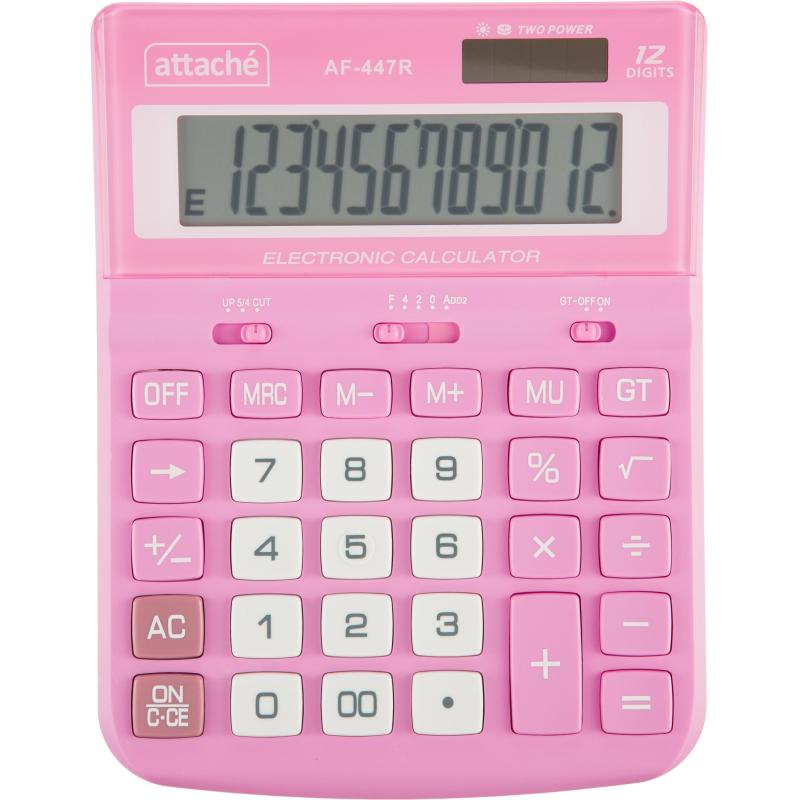 Калькулятор Attache настольный AF-447R полноразмерный с 12-разрядным ЖК-дисплеем.<br> Эргономичная форма панели и крупные клавиши создают максимальный комфорт в использовании. Корпус изготовлен в розовом цвете с кнопками белого цвета. Оптимальный и необходимый набор функций, среди которых: MC, MR, M+, M-, GT, MU, расчет процентов, округление. Функция коррекции вычислений: нет. Функция вычисления налога: нет. Пересчет курса валюты: нет. Наклонный дисплей: фиксированный. Большой двенадцатиразрядный дисплей отображает большие значения с высокой точностью округления. В калькуляторе имеется два источника питания: батарейка типа LR44 (входит в комплект) и солнечная батарея. <br> Размер калькулятора: 198×153×42 мм. Материал корпуса и клавиатуры: пластик. Вес: 0.23 кг. Число строк дисплея: 1. Цвет: розовый. Гарантийный срок: 12 мес.
