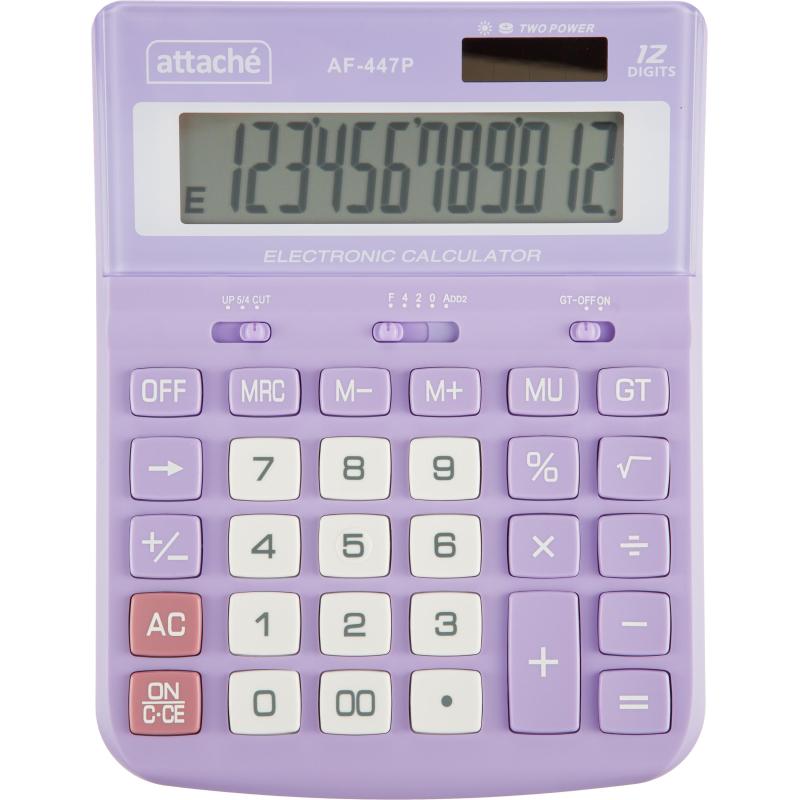 Калькулятор Attache настольный AF-447Р полноразмерный с 12-разрядным ЖК-дисплеем.<br> Эргономичная форма панели и крупные клавиши создают максимальный комфорт в использовании. Корпус изготовлен в фиолетовом цвете с кнопками белого цвета. Оптимальный и необходимый набор функций, среди которых: MC, MR, M+, M-, GT, MU, расчет процентов, округление. Функция коррекции вычислений: нет. Функция вычисления налога: нет. Пересчет курса валюты: нет. Наклонный дисплей: фиксированный. Большой двенадцатиразрядный дисплей отображает большие значения с высокой точностью округления. В калькуляторе имеется два источника питания: батарейка типа LR44 (входит в комплект) и солнечная батарея. <br> Размер калькулятора: 198×153×42 мм. Материал корпуса и клавиатуры: пластик. Вес: 0.23 кг. Число строк дисплея: 1. Цвет: фиолетовый. Гарантийный срок: 12 мес.