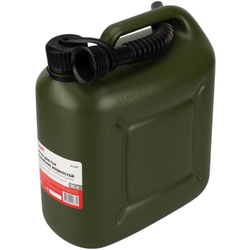 Канистра для ГСМ Rexant пластиковая 10 л<br><br>Вертикальная усиленная канистра объемом 10 л предназначена для хранения и транспортировки топлива и горюче-смазочных материалов. <br><br>Преимущества:<br>• Изготовлена из высококачественного прочного (первичного в производстве) полиэтилена (ПЭНД). <br>• Изделие имеет международный сертификат соответствия перевозки легковоспламеняющихся грузов, наличие которого дает возможность заправлять канистру на любых АЗС на территории РФ и ЕС.<br>• Утолщенные стенки позволяют выдержать высокие нагрузки при экстремальных условиях эксплуатации. Боковые ребра жесткости и усиленный шов на дне обеспечивают прочность и сохранение формы. <br>• Эргономичная широкая ручка и выемка на дне для руки позволяют удобно держать изделие.<br>• На крышке предусмотрена защита, предотвращающая доступ детей к открытию канистры. <br>• Широкая горловина упрощает залив топлива. Гофрированный гибкий шланг с системой «антибульк» минимизирует риск разлива или брызг. Широкая уздечка держания заливного шланга не прокручивается вместе с крышкой и не ломается на морозе. <br>• Масло- и бензостойкий уплотнитель на крышке и антистатические присадки обеспечивают дополнительную безопасность.<br><br>Внешний вид и/или характеристики товара могут быть изменены производителем в соответствии с производственным процессом.
